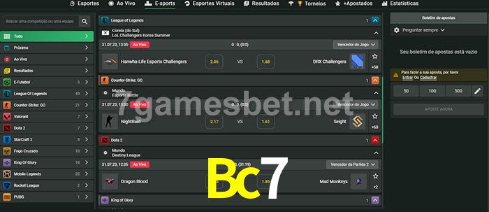 O Bc7 oferece uma grande seleção de opções de apostas em e-sports com probabilidades competitivas
